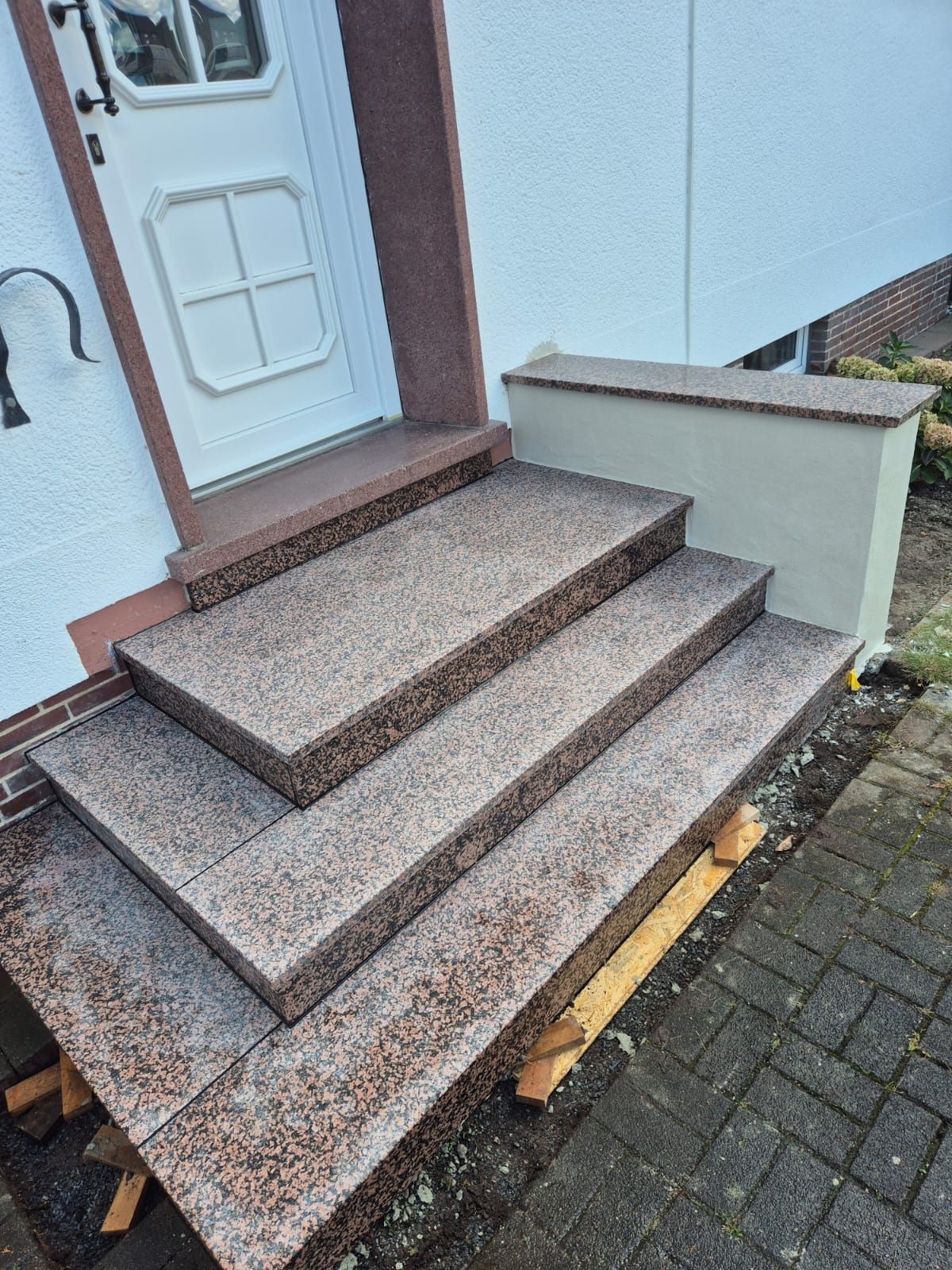 Wir realisieren Treppen aus verschiedenen Materialien: robuste Betontreppen, elegante Granittreppen oder klassische Natursteintreppen. Dabei übernehmen wir als Fachbetrieb den kompletten Prozess – von der Planung über die Materialauswahl bis zum fachgerechten Einbau. Besonders bei Außentreppen achten wir auf Witterungsbeständigkeit und rutschfeste Oberflächen.